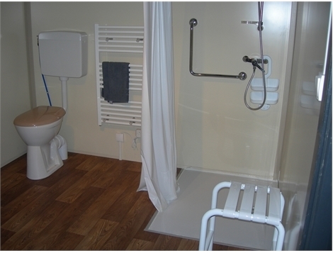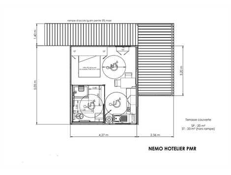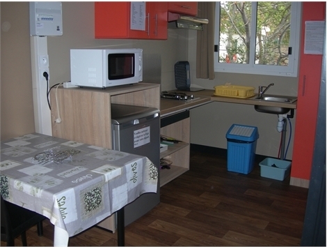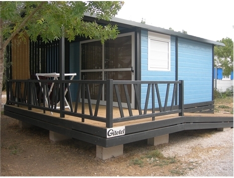 Le Mobil-home est équipé de vaisselle, d’un salon de jardin, et d’une terrasse en bois ainsi qu'une rampe d'accés.